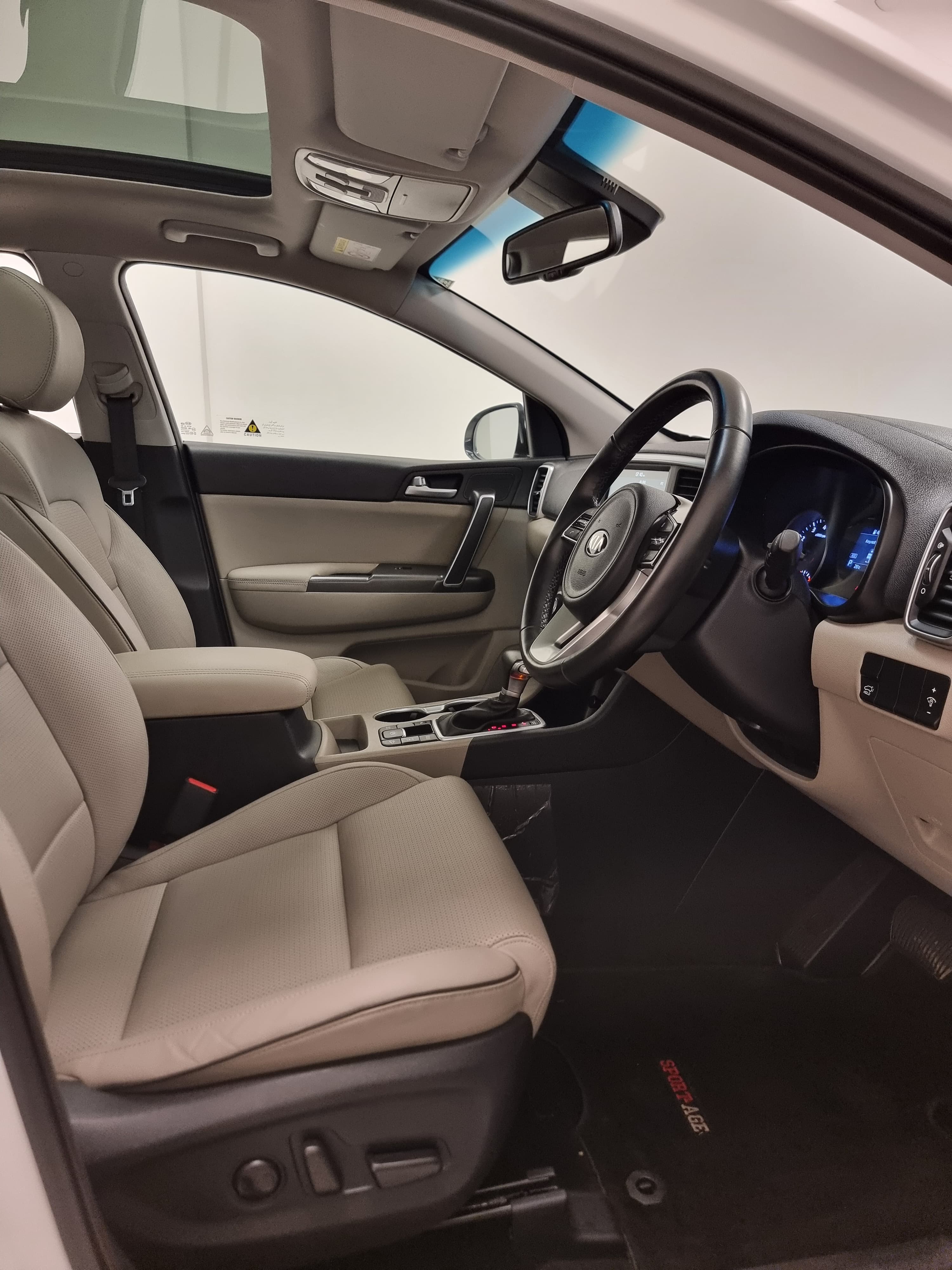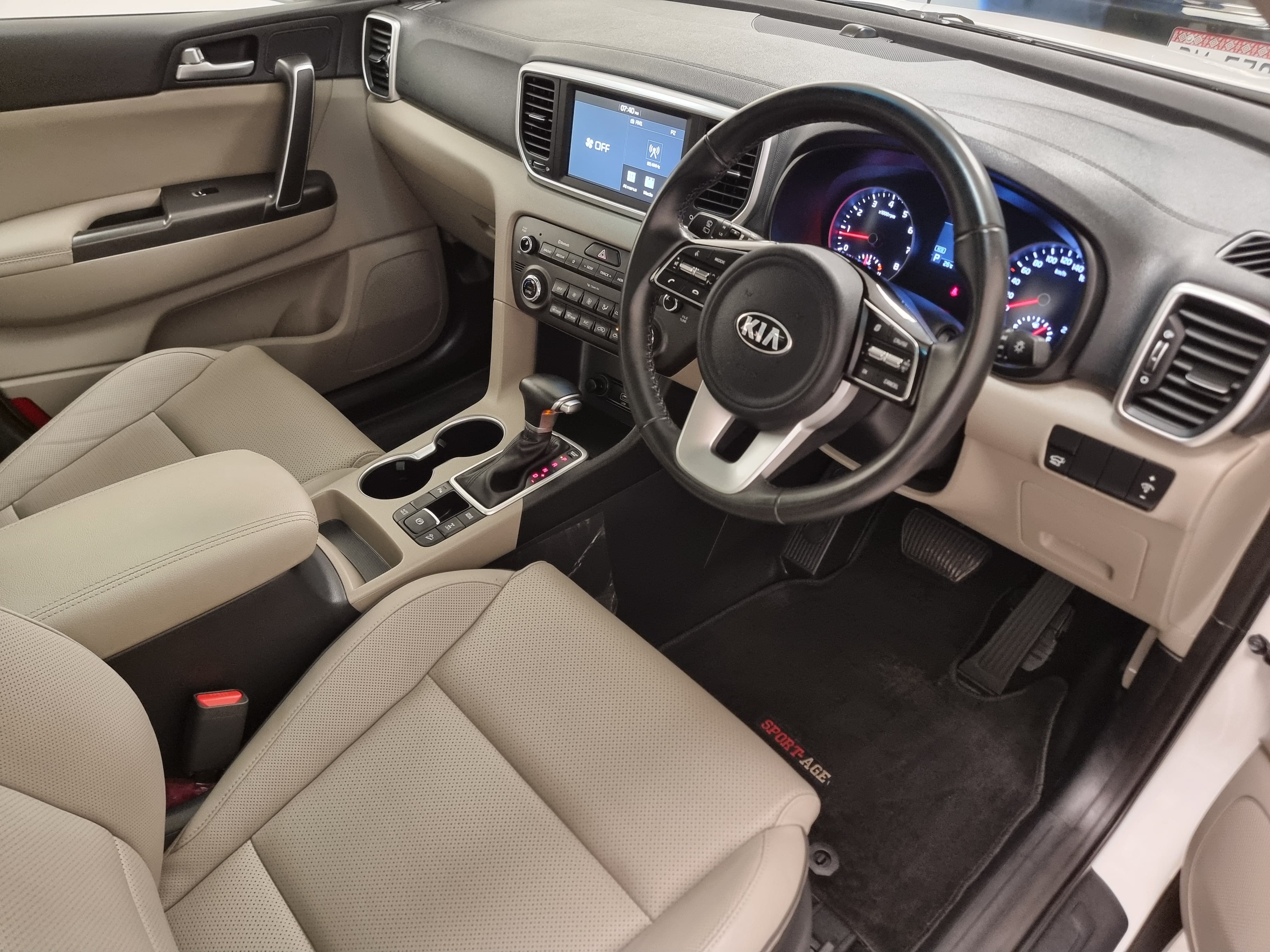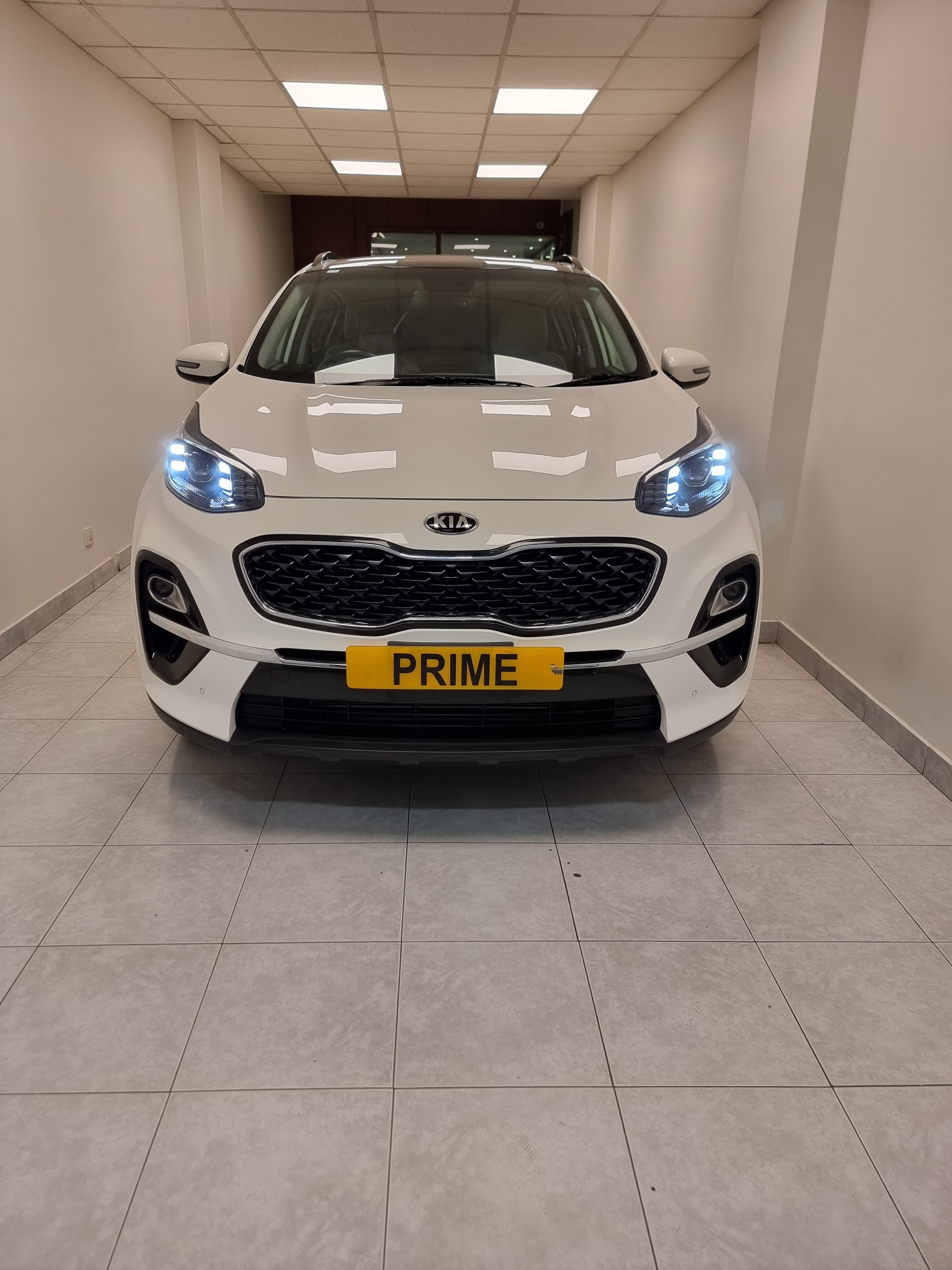 With a sleek white exterior, bold front grille, and striking LED headlights, the Kia Sportage stands out on the road. The aerodynamic design enhances performance while maintaining a sporty and sophisticated look.